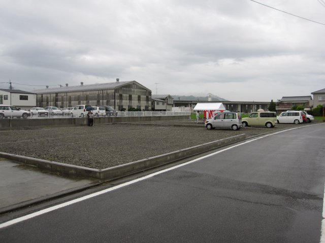 仕切りから向こうの二階建ての白い壁までが日清ワークスになります。